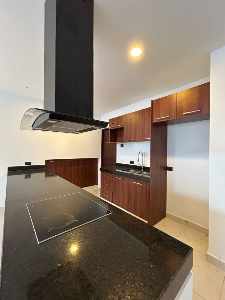 Cocina abierta equipada con parrilla, campana y alacena.