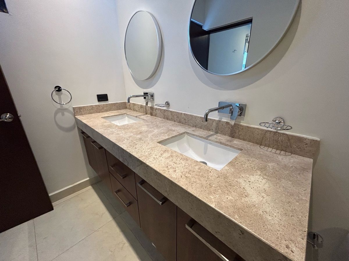 Recámara principal con clóset vestidor, baño completo y doble lavamanos.