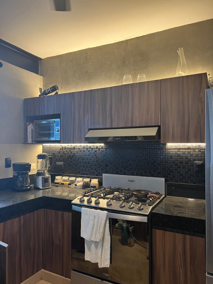 Cocina con carpintería, estufa, campana y refrigerador