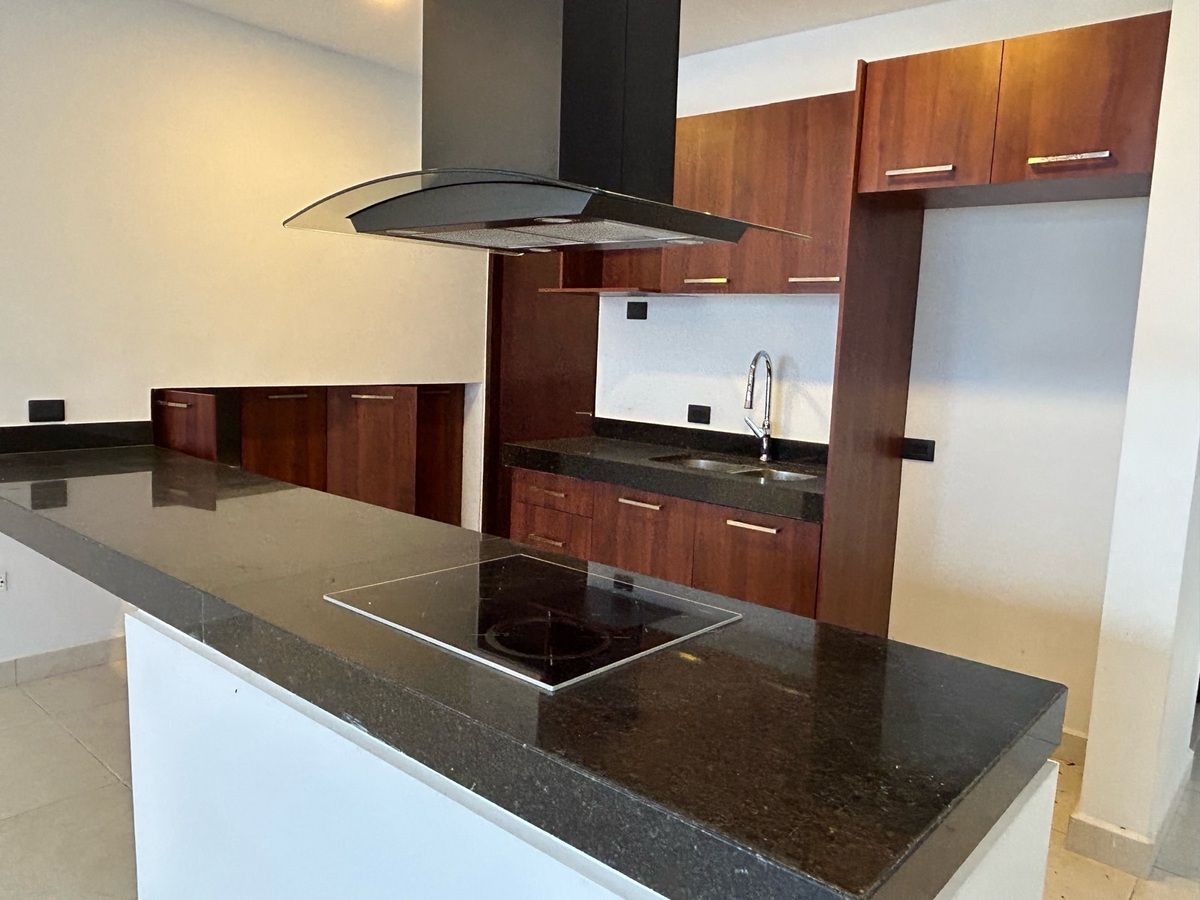 Cocina abierta equipada con parrilla, campana y alacena.