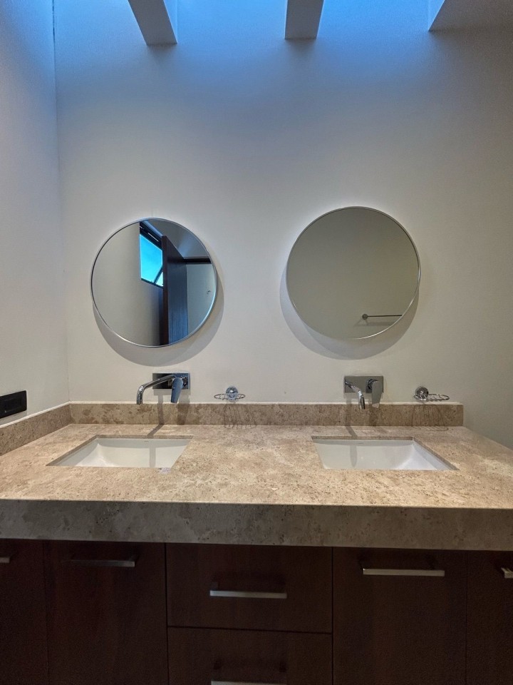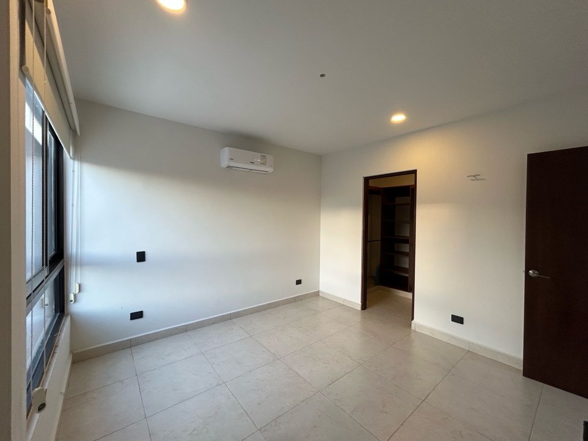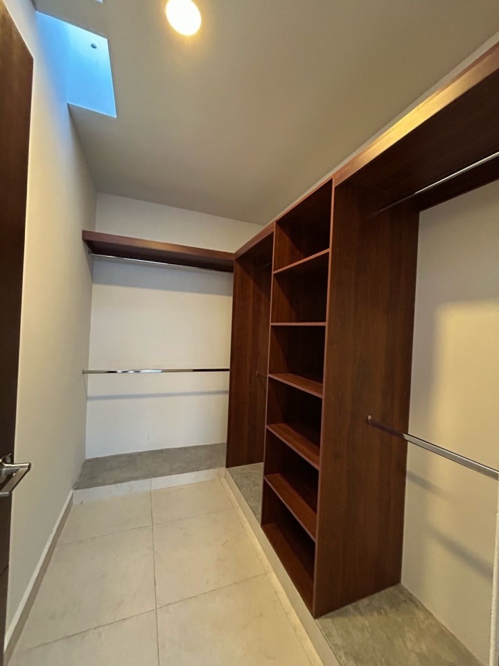 Recámara principal con clóset vestidor, baño completo y doble lavamanos.